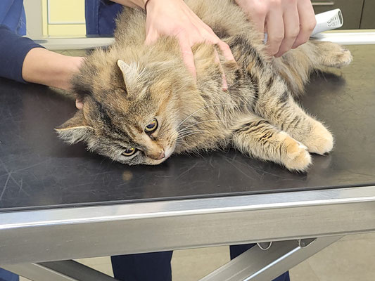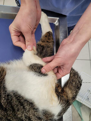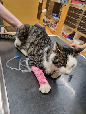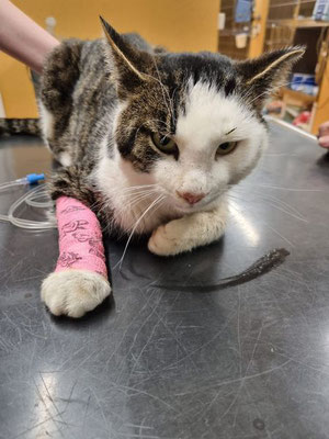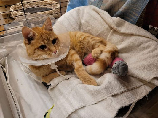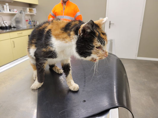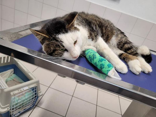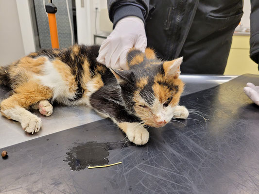 Dort wurde er einer Erstuntersuchung unterzogen. Das rechte Hinterbein und der Kopf sind geschwollen. Das würde zum Verdacht Autounfall passen. Urin läuft aus und die Blut-/Nieren-/ und Leberwerte müssen nochmals genauer untersucht werden.