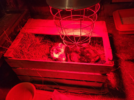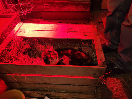 Bobby muss diese Nacht unter der Wärmelampe verbringen, da seine Körpertemperatur stark absinkt, das hat sicher auch mit seiner neuen "Frisur" zu tun. So haben wir ihm für heute Nacht ein warmes Bettchen hergerichtet