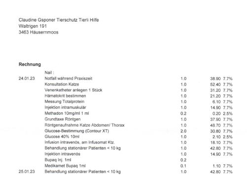 Die Rechnung der regionalen Tierarztpraxis beträgt um die CHF 900.- und in der Klinik wird ein stationärer Tag mit CHF 150.- bis 250.- verrechnet. Dazu kommen röntgen, Blutuntersuchungen etc.