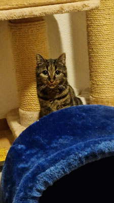 Die anderen Katzen im Katzenzimmer interessieren sie, aber sie ist auch recht unsicher anderen Katzen gegenüber.
