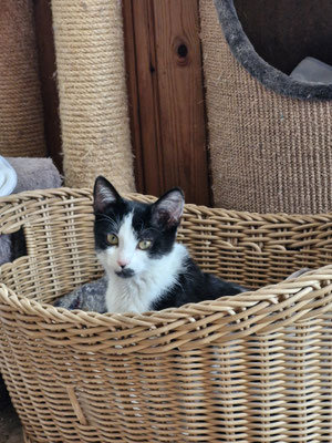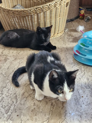 Ziva (schwarz-weiss) und Yuki (schwarz) sind zusammen mit ihren 2 Geschwistern, am 5. Juli 2025 bei der Tierlihilfe eingezogen.