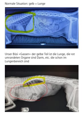 Kurz nachdem wir sie im Kleintierzentrum Huttwil - Schulthess Tierärzte zum Kastrieren abgegeben hatten, haben sie uns auch schon angerufen und mitgeteilt, dass Kimi nicht kastriert werden kann. Ihnen ist aufgefallen, dass sie schwer/komisch atmet und ein RÜntgen hat die traurige Wahrheit ans Licht gebracht.